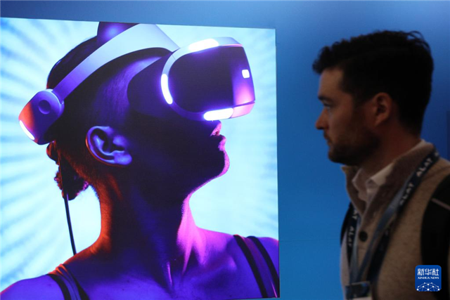 3月3日,在西班牙巴塞罗那举行的2025年世界移动通信大会上,一名参观者走过头显设备展台。新华社记者 赵丁喆 摄