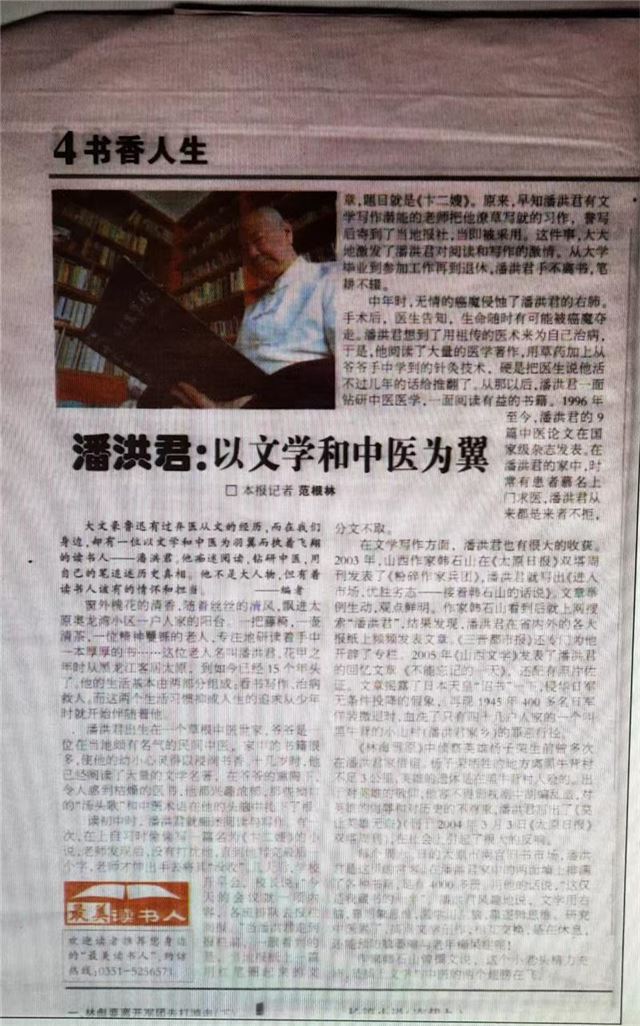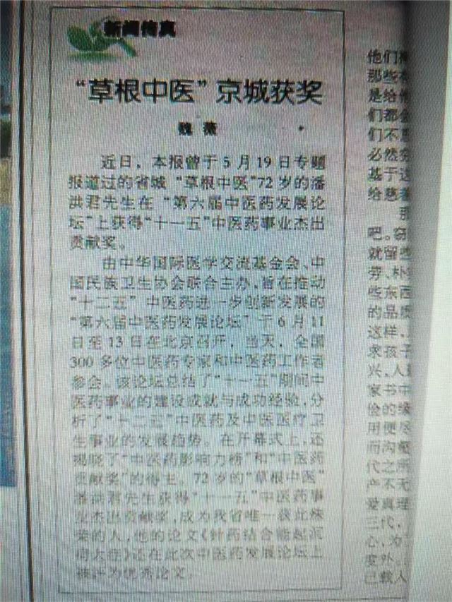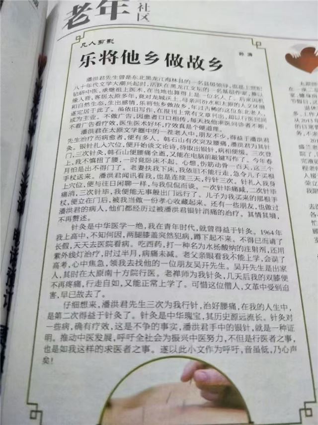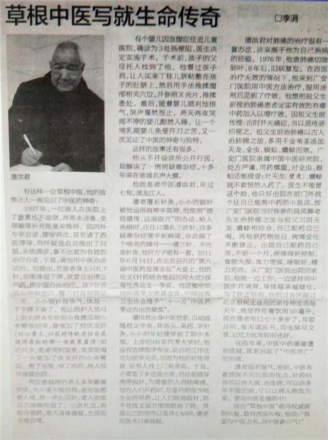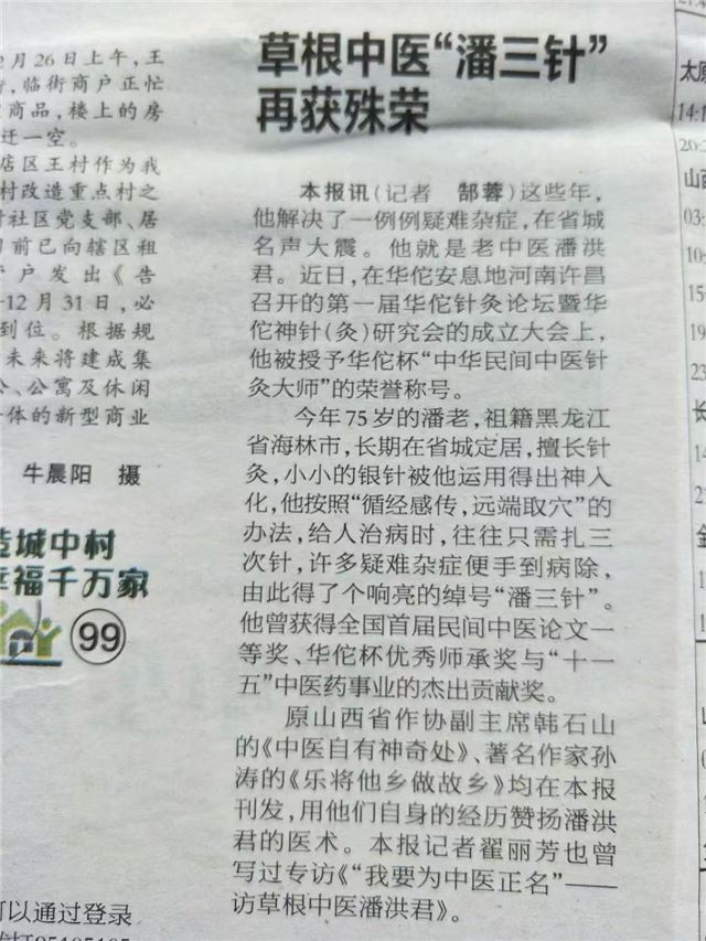 1975年在阜外医院经陈宝田主任主刀肺癌朮后,扛不住放,化疗副作用,改用中医药自救,现己过去五十年,八十六岁仍耳聪目明,喜爱游泳,打乒乓球。从癌症患者到中草药治癌奇人。可至今,省委书记张宝顺同志批示中重点提到,结果山西省人民医院一份申请报两人,却非将我沒有补证?!参加确有专长考试,有多篇医学论文在全国获奖,却不如连《伤寒论》都认不全,个人藏中医书(不计中医杂志》已超万册,救治肿瘤医院,301医院,广安门医院沒能治好的病人可圈可点。《手法免除幼儿肠梗阻手朮之苦》入编《杏林名医名方名朮典藏》。《潘氏三针疗法》成推广技朮。一位1962年大专毕业,1964年奉命创办黑龙江省海林县卫校,是首届只招一个班班主任的家传中医,为中医奋斗了六十余年,却在中医确有专长考试中名落孙山?!尽管有华佗针炙硏究会顾问,民间中医硏究会抗衰老分会副会长诸作职务,至今连最基本地中医师证都领不到,为躲避行政处罚避难途中。就不再参加任何有关中医地活动了!!!