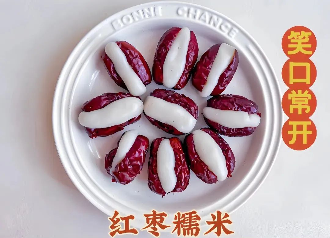 2.接着把糯米团取出,适量搓成椭圆形,再塞在红枣里面,摆放盆中,上锅蒸个15分钟。把它们蒸熟,蒸熟之后摆放盆中即可。